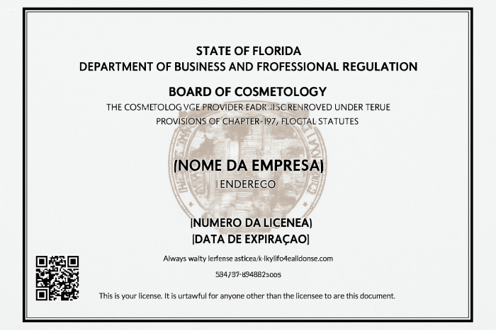• Licença de Cosmetologia da Flórida: Baseada em modelo oficial do DBPR - Florida Department of Business and Professional Regulation (dados pessoais removidos para fins ilustrativos